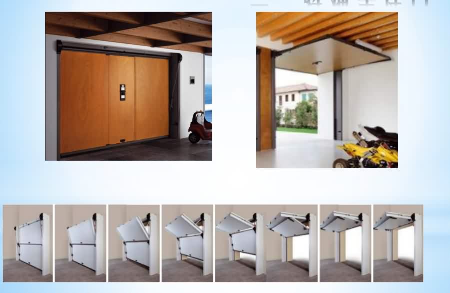 無軌車庫門是翻板車庫門的一種,所有機械裝置、驅動裝置都隱藏在門體上方及左右兩側,開門機轉動帶動機械移位,門體上方開啟。無軌車庫門安裝便捷,因為沒有彎軌和牽引軌道,車庫內整潔,美觀,特別適用于車庫條件有限,豪華裝修的高端用戶